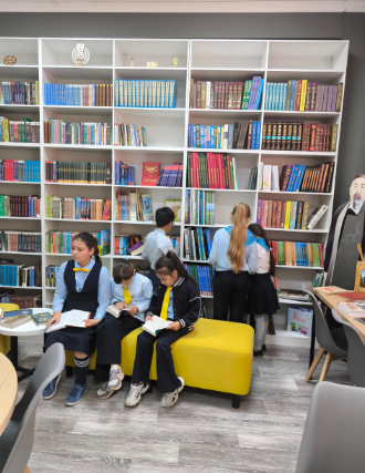 Біздің мектепте күнде «оқу үзілістері» болады; үзіліс кезінде оқушылар кітапханаға барады.