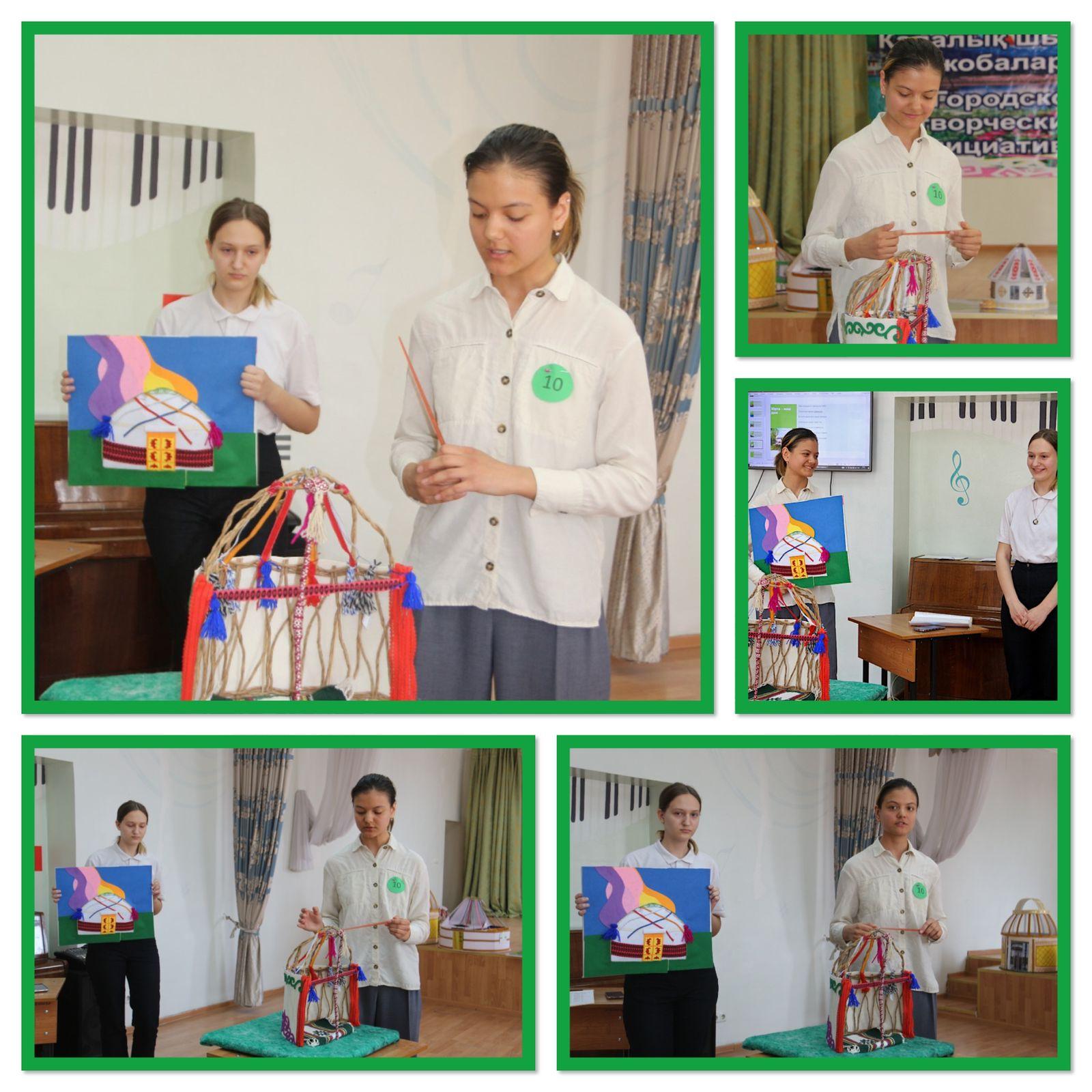 В городском творческом конкурсе талантов: «Моя инициатива – моей Родине» приняла участие ученица 10 «Б» класса КГУ ШЛ №71 Володина Амина, проектная работа состояла из доклада на тему: «Юрта- модель вселенной», и ученицей был выполнен макет юрты.