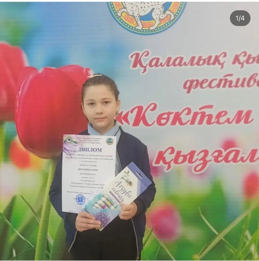 Награждение Шеховцовой Дарьи ученицы 4 класса КГУ ШЛ71 - занявшая 1 место в городском фестивале рисунков "Көктем көркі - қызғалдақ" в номинации "Назар аударыңыз, көктемнің алғашқы гүлдері".