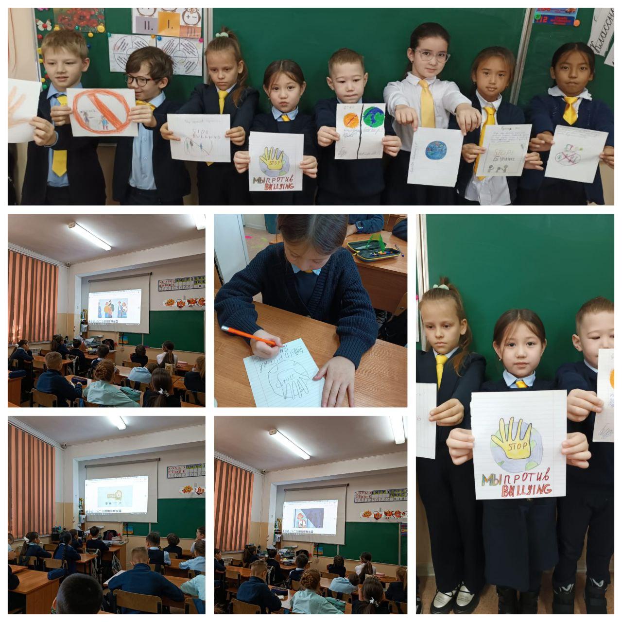 18 қарашада № 71 мектеп-лицейде бастауыш сынып оқушыларына арналған маңызды сынып сағаты өтті, онда «Өзін Буллингтен қорғау!», «Бала құқықтары» және «ТЖ телефон нөмірлері» тақырыптары қозғалды. Кездесуде балалар буллингтің не екенін, оны қалай тану керектігін және егер балалар немесе олардың достарының біреуі осындай жағдайға тап болса, не істеу керектігін білді. Біз ұжымдағы өзара құрмет, қолдау және мейірімділіктің маңыздылығын талқыладық. Балалар буллингке қарсы тұруға көмектесетін құрдастарымен достық және өзара қарым-қатынас ережелерін жасап, жазып алды.