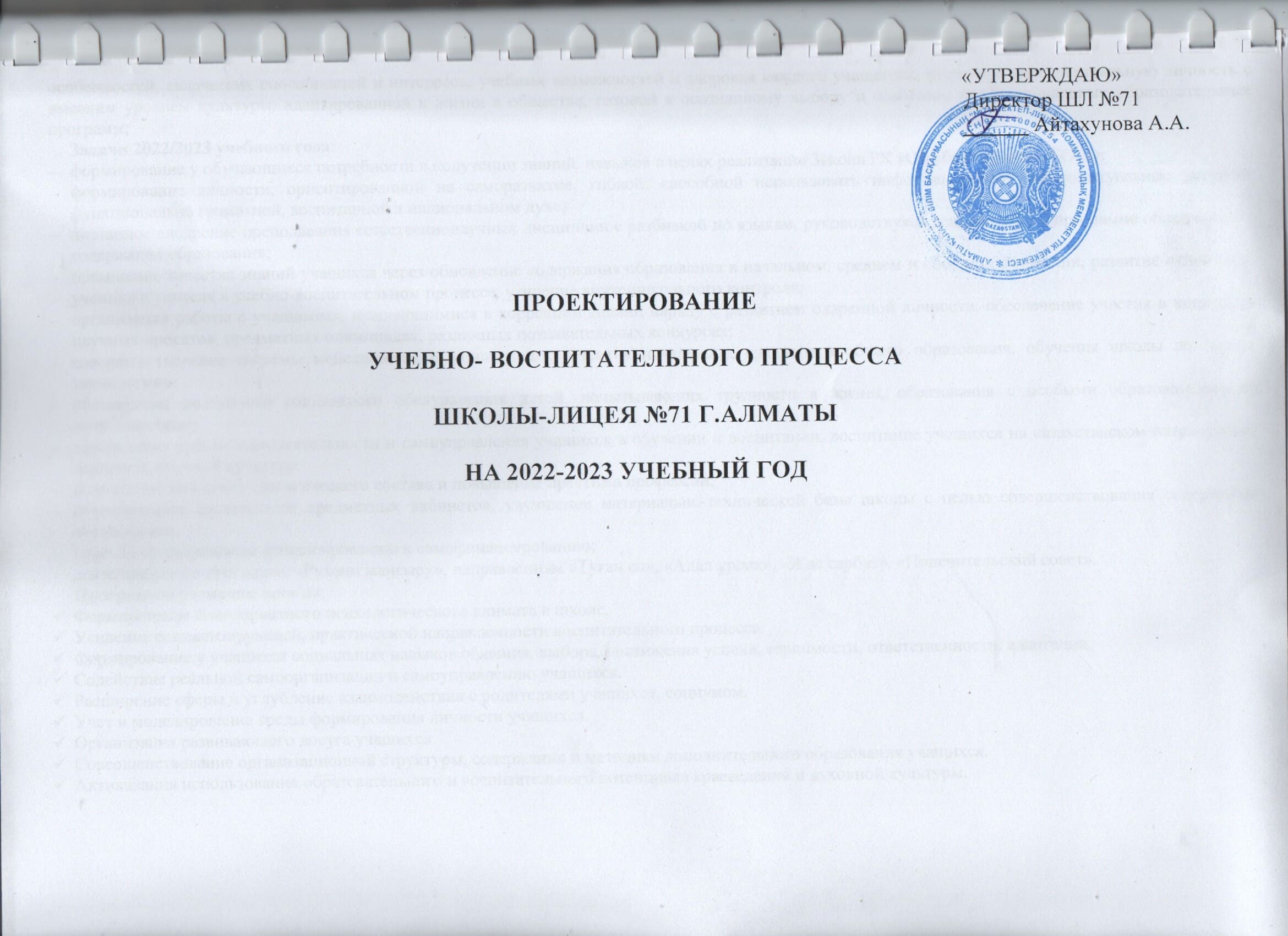 2022-2023 оқу жылына арналған № 71 мектеп-лицейдің оқу-тәрбие процесін жобалау/Проектирование учебно-воспитательного процесса Школы-лицея №71 на 2022-2023 учебный год