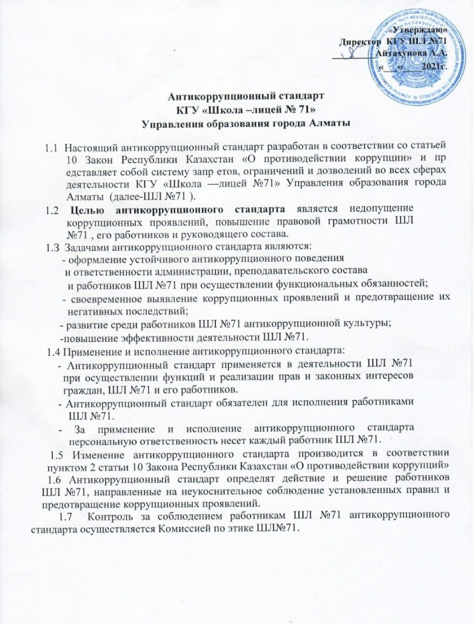 13 қазан 2021 0 1 2 3 4 5 2021-2022 оқу жылындағы №71 Мектеп - лицейі КММ нің сыбайлас жемқорлыққа қарсы стандарты/Антикоррупционный стандарт на 2021-2022 учебный год