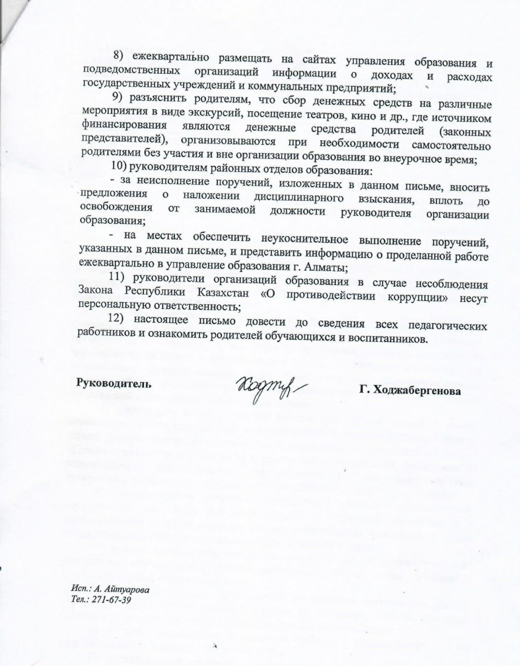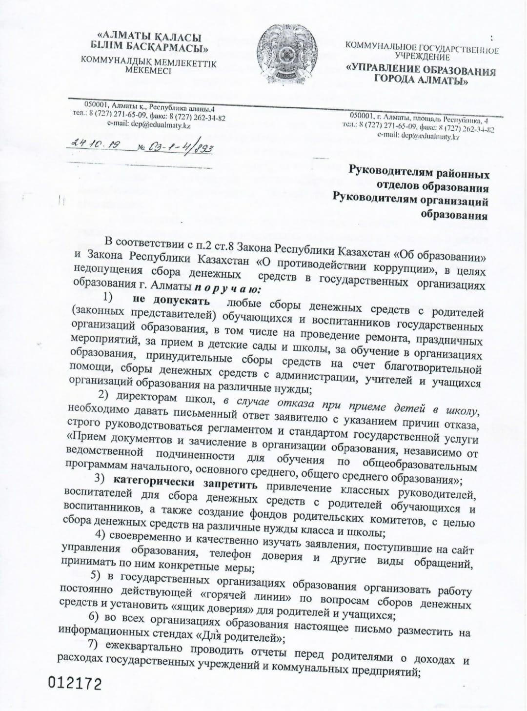 » Ақша жинауға тыйым салу туралы бұйрық/Приказ о запрете сбора денег