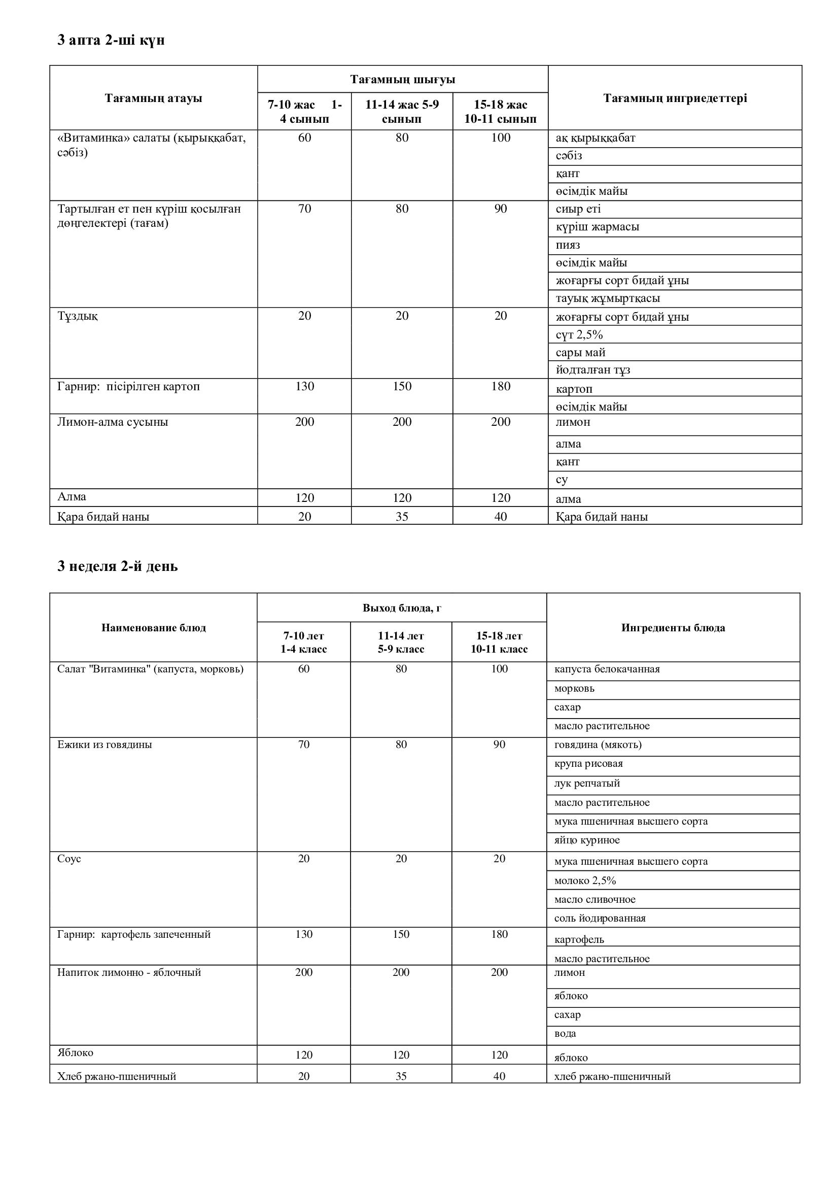 15.09.2025 жылына арналған ас мәзірі/Меню на 15.09.2025
