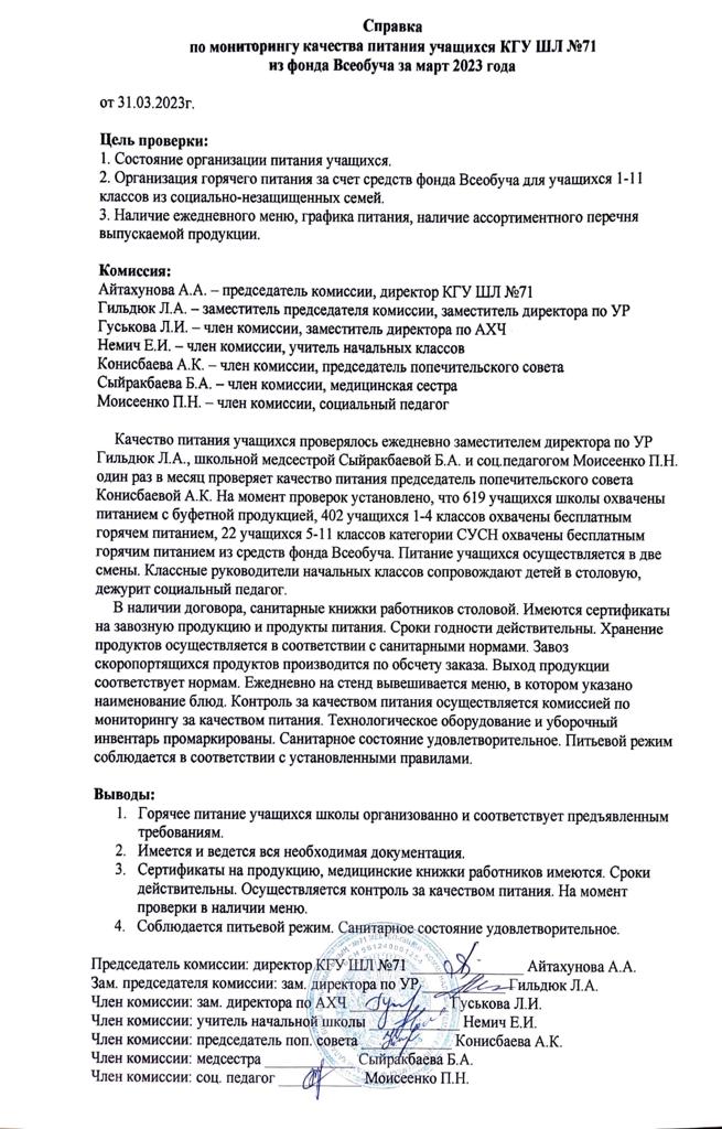 » Тамақтандыру » Сапалық мониторинг » 2023 жылдың наурыз айындағы тамақтану сапасының мониторингі жөніндегі комиссияның есебі/Отчет комиссии по мониторингу за качеством питания за март 2023 год
