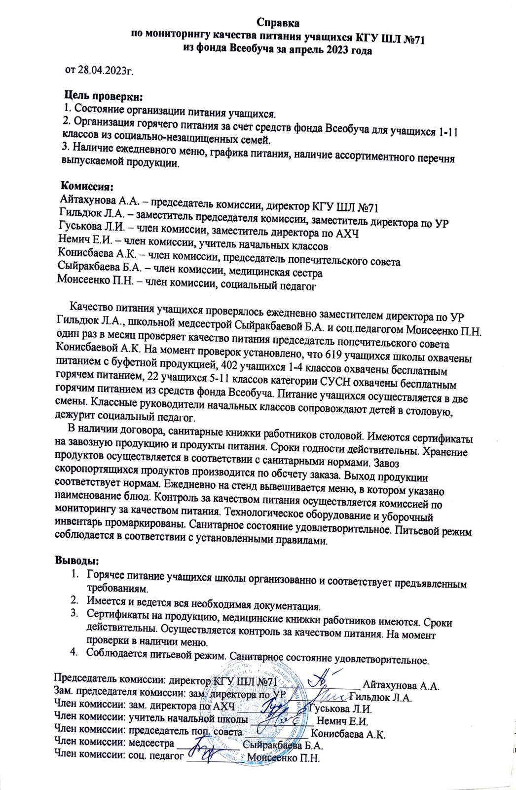 2023 жылдың сәуір айындағы тамақтану сапасының мониторингі жөніндегі комиссияның есебі/Отчет комиссии по мониторингу за качеством питания за апрель 2023 год