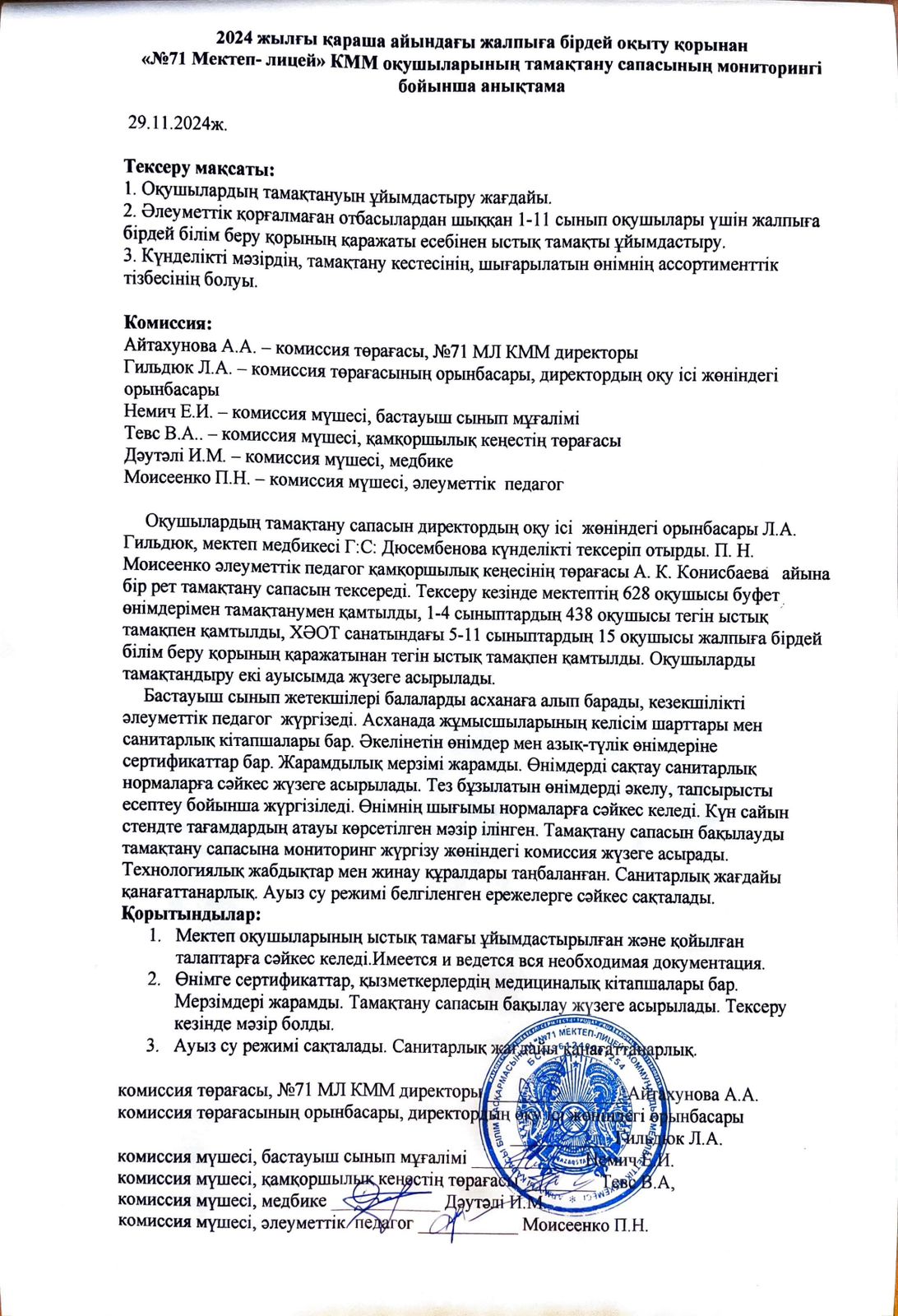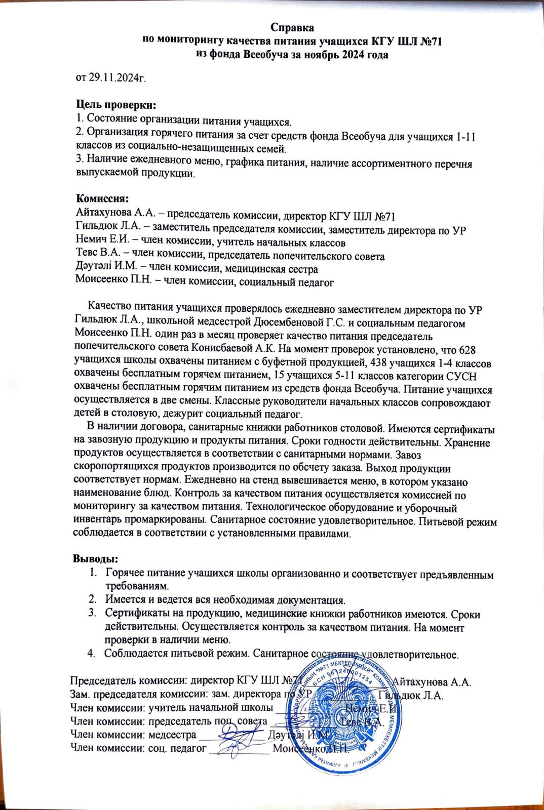 29 қараша 2024 0 1 2 3 4 5 2024 жылдың қараша айындағы тамақтану сапасының мониторингі жөніндегі комиссияның есебі/Отчет комиссии по мониторингу качества питания за ноябрь 2024