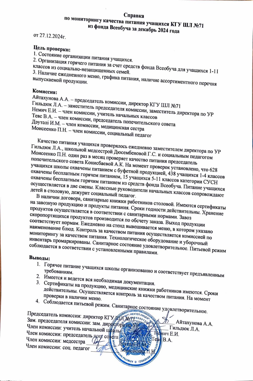 » Тамақтандыру » Сапалық мониторинг » 2024 жылдың желтоқсан айындағы тамақтану сапасының мониторингі жөніндегі комиссияның есебі/Отчет комиссии по мониторингу качества питания за декабрь 2024