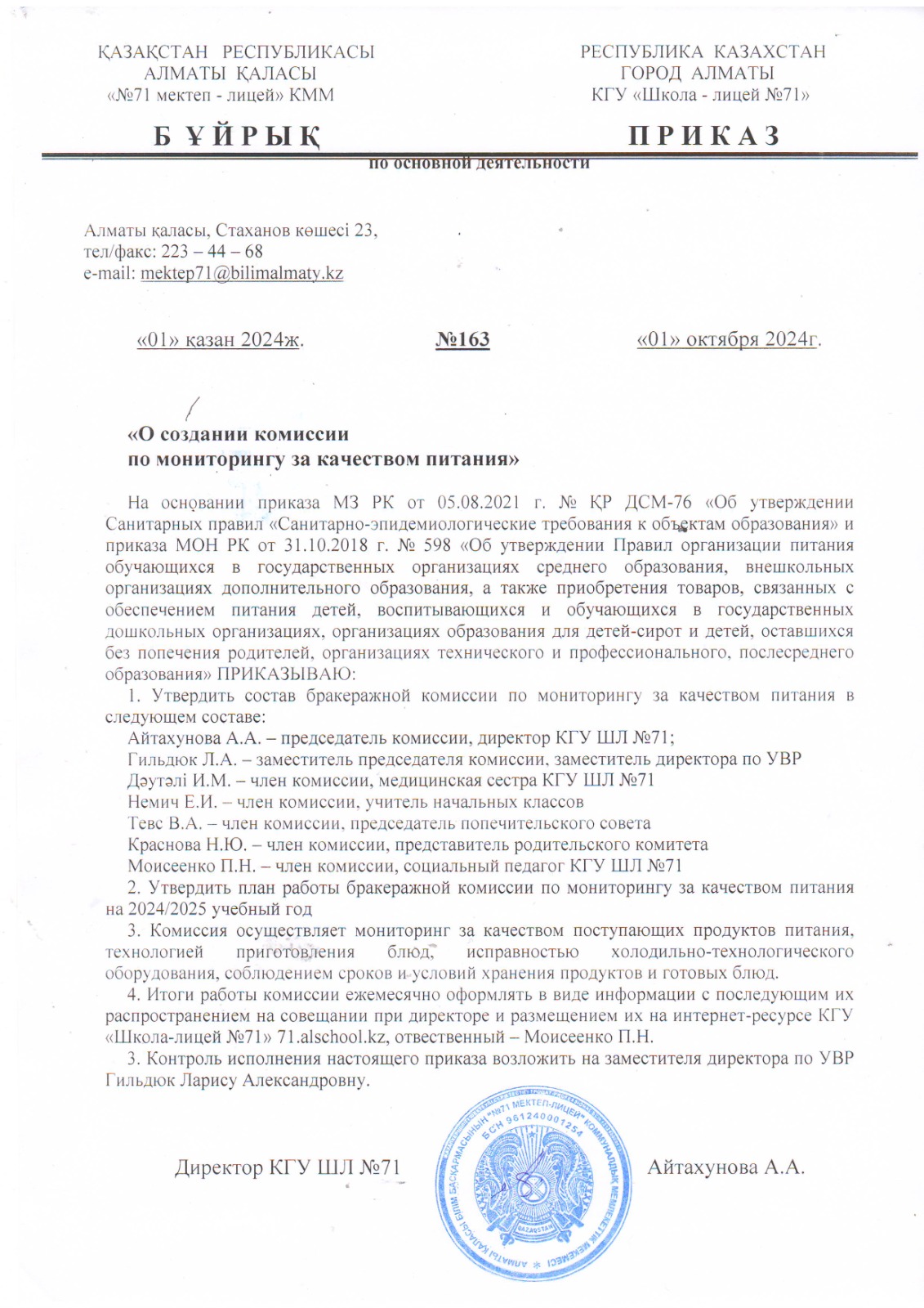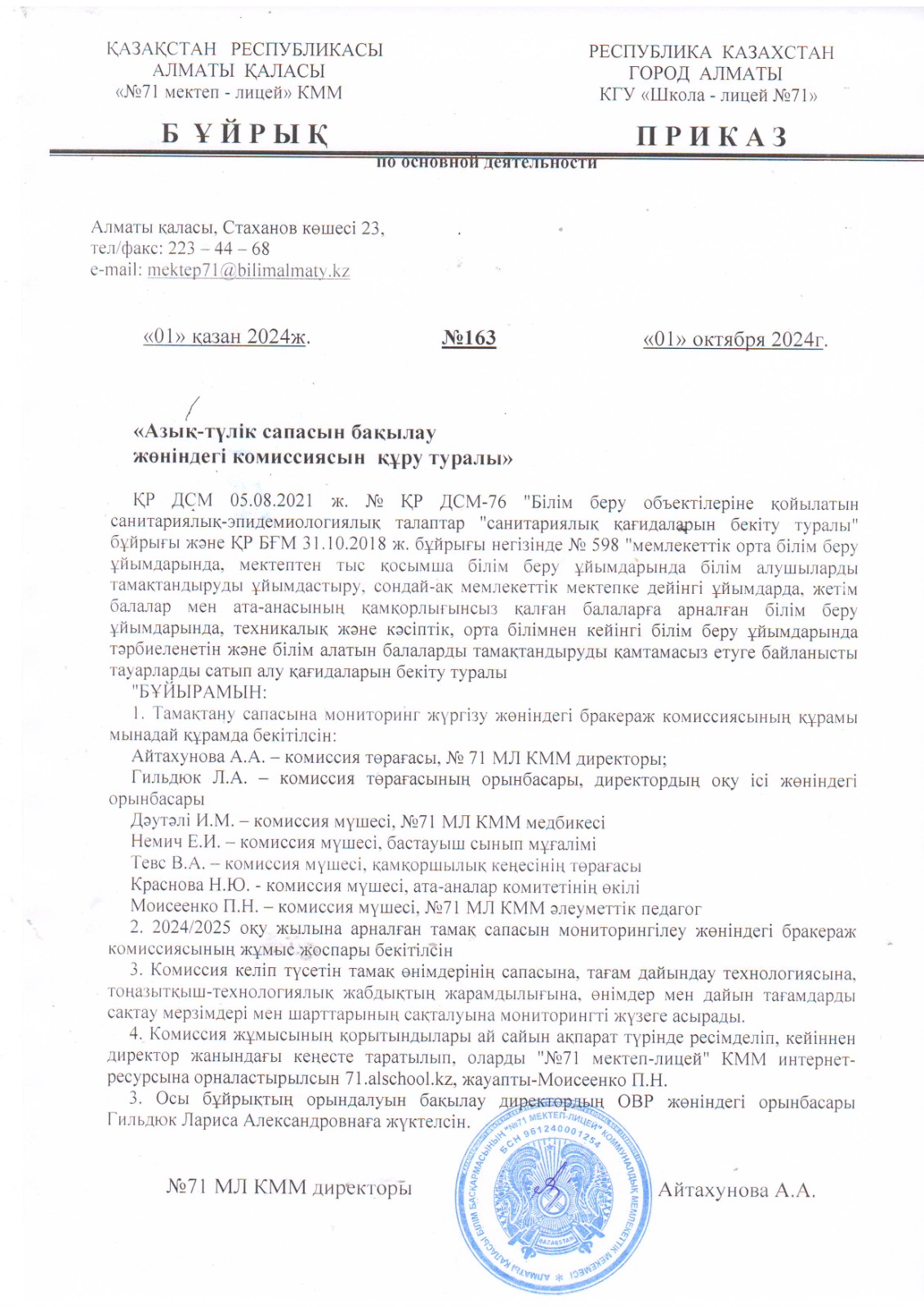 01 қазан 2024 0 1 2 3 4 5 "Тамақтану сапасын мониторингтеу жөніндегі комиссия құру туралы"/Приказ о создании комиссии по мониторингу за качеством питания