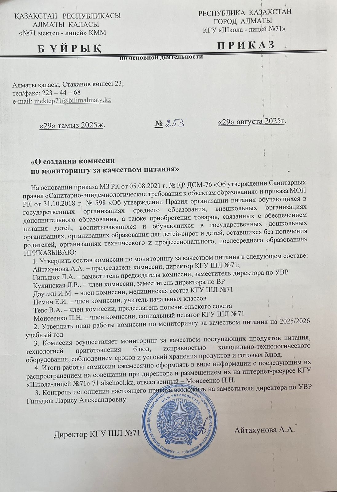 29 тамыз 2025 0 1 2 3 4 5 "Тамақтану сапасын мониторингтеу жөніндегі комиссия құру туралы"/Приказ о создании комиссии по мониторингу за качеством питания