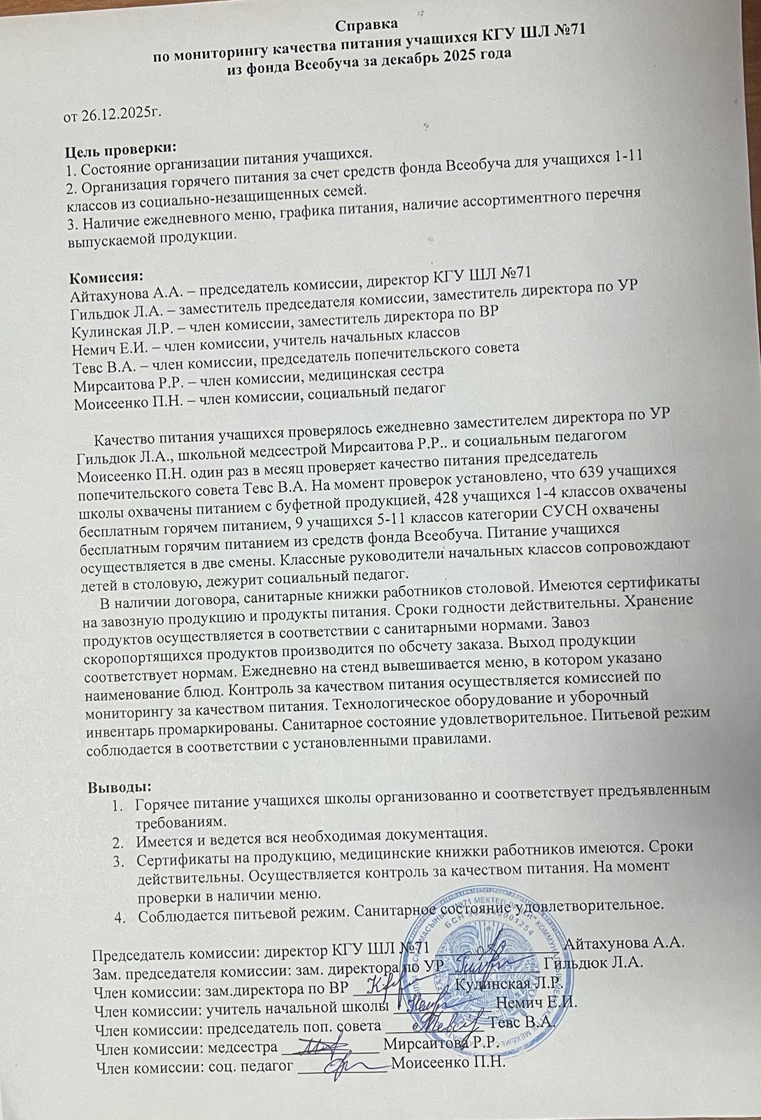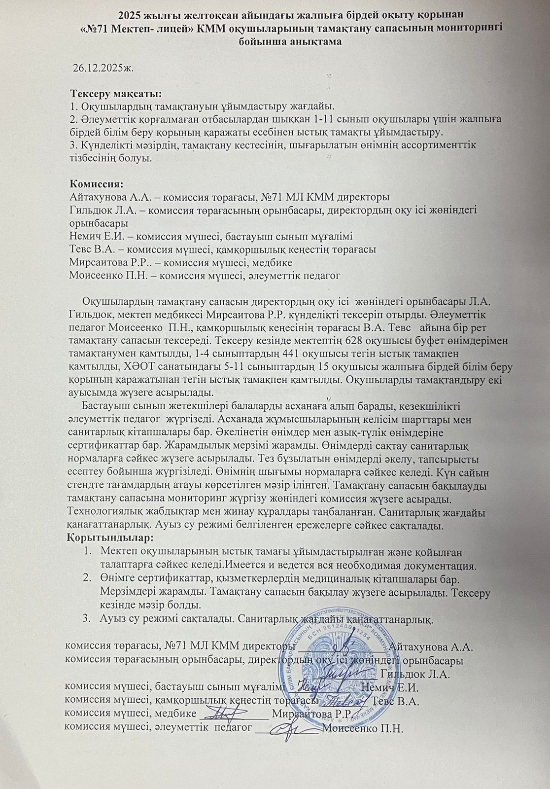 » Тамақтандыру » Сапалық мониторинг » 2025 жылдың желтоқсан айындағы тамақтану сапасының мониторингі жөніндегі комиссияның есебі/Отчет комиссии по мониторингу качества питания за декабрь 2025